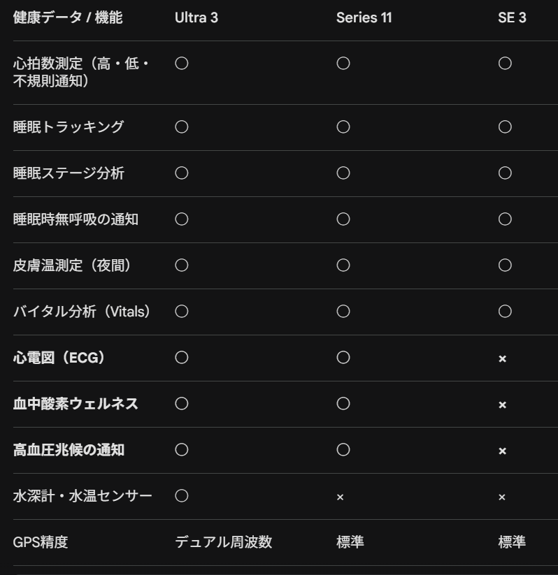 健康管理を重視するなら: ECGと血中酸素が使える Series 11 または Ultra 3 がおすすめです 。